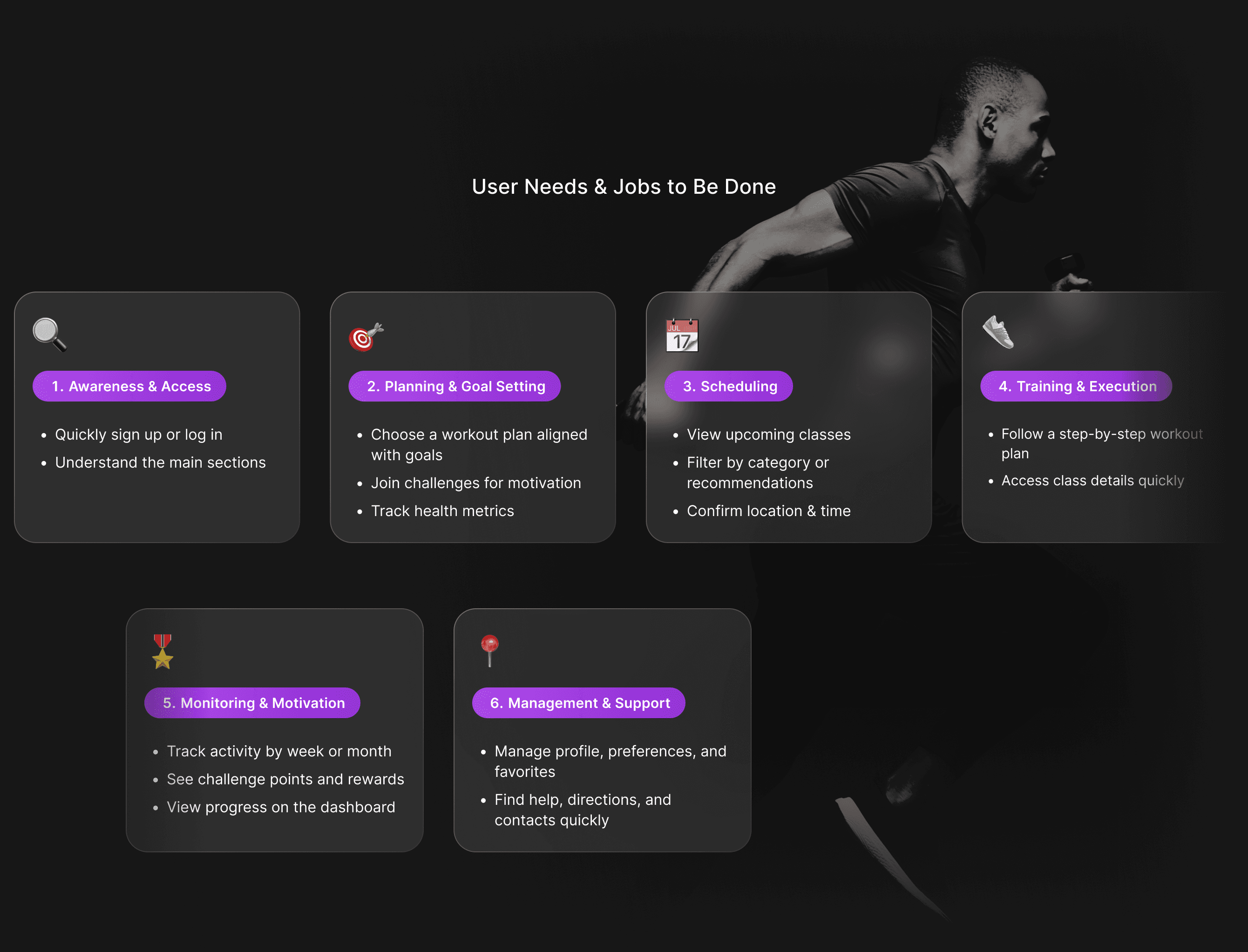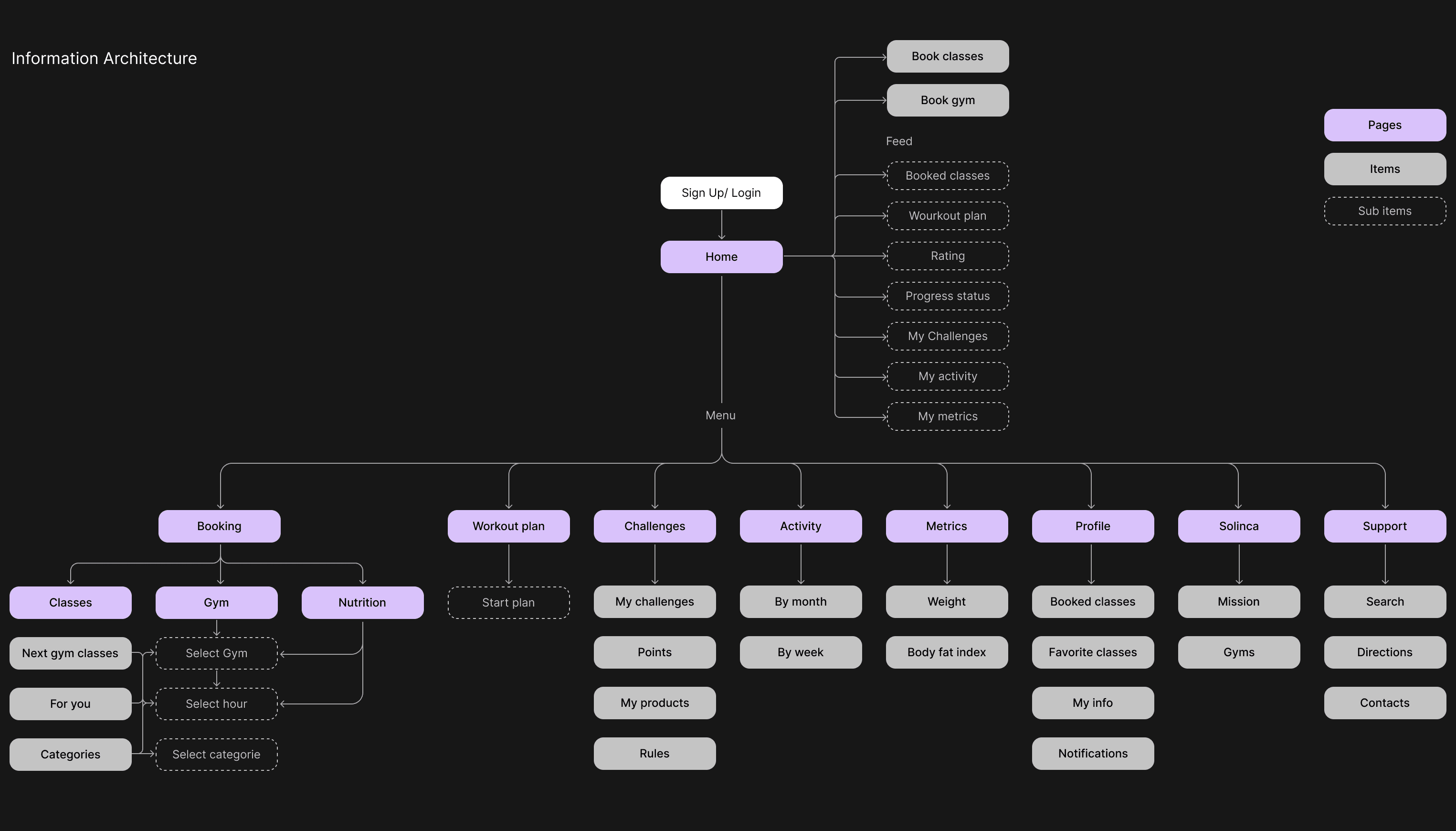 We identified user needs and mapped the essential Jobs to Be Done across the full fitness journey. These insights were then translated into a clear Information Architecture that structured the app’s core sections, flows, and content hierarchy.