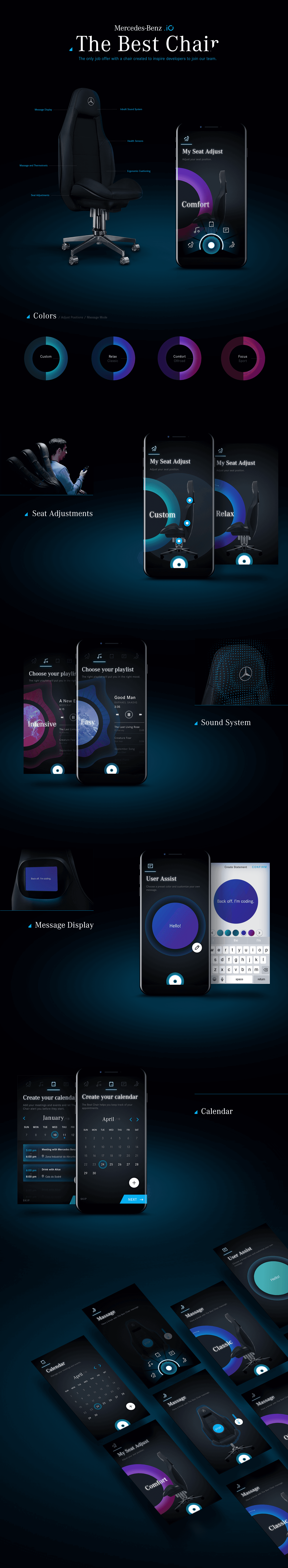 Working in a creative tech agency, I was responsible for defining and designing the full digital experience that connected the chair to the user. I designed a mobile app that allowed visitors to adjust their seat settings, explore the chair’s “car-like” features, and engage with the brand through a playful yet premium interaction model. This included: • Mapping the experience from event onboarding to chair interaction • Designing flows for personalizing the chair (position, temperature, lights, etc.) • Creating a visually rich UI aligned with Mercedes-Benz’s design language The result was a seamless, high-impact experience true to Mercedes-Benz’s premium identity.