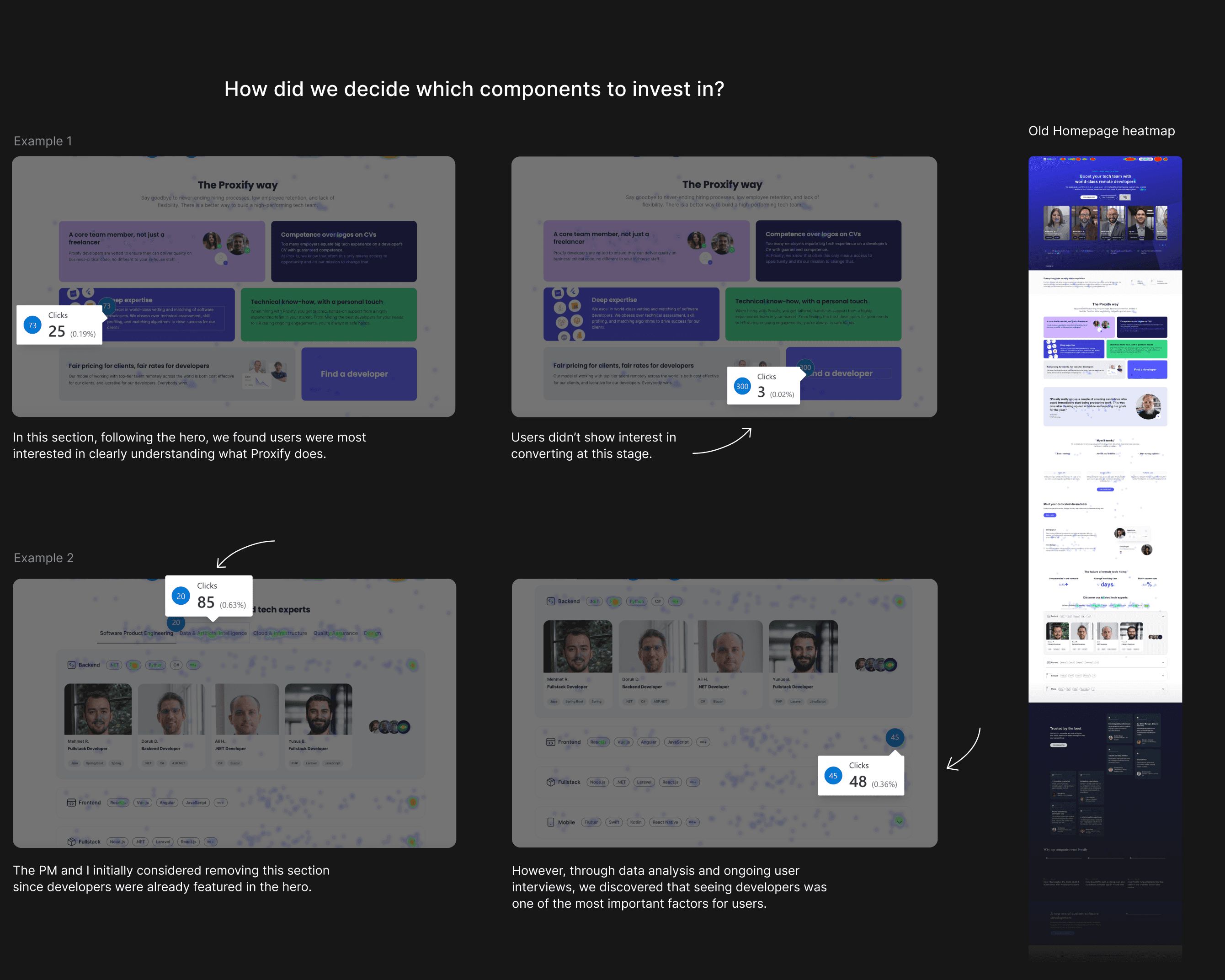 I mapped existing website components and analysed behaviour with Clarity heatmaps to identify what users engaged with, ignored, or struggled with.